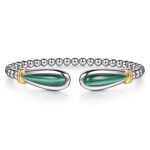 Indulge in elegance with our 14 Karat Yellow Gold and Sterling Silver Bujukan Bangle Bracelet, set with Malachite. The rich green hue of the Malachite stones is beautifully complemented by the warm glow of yellow gold and the shine of sterling silver. Designed for versatility, this bangle transitions seamlessly from day to night, enhancing any ensemble with its understated glamour. The intricate Bujukan bead detailing adds a touch of texture, while the open cuff design ensures a comfortable fit for any wrist size.