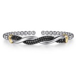 Step into sophistication with our 14 Karat Yellow Gold and Sterling Silver Bujukan Black Spinel Twisted Bangle Bracelet. The bangle's unique twisted design is pave set with black spinels. Lightweight and comfortable, it's an ideal accessory for those who prioritize both style and comfort.
