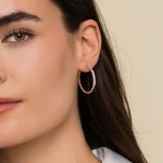 14 Karat Yellow Gold 30mm Bujukan Diamond Classic Hoop Earrings. These hoops feature a blend of polished yellow gold and shimmering diamonds. The unique Bujukan bead design adds texture and depth, while the sparkle of the diamonds gracefully line the front. With a 30mm size, these earrings effortlessly transition from day to night, adding a touch of glamour to any ensemble. These diamonds have a total carat weight of 0.31 carats.
