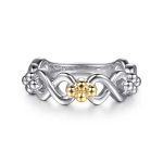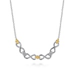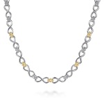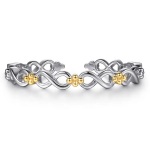 14 Karat Yellow Gold and Sterling Silver Bujukan Infinity Intricate Hoop Earrings. These hoops blend the warmth of yellow gold with the sleekness of sterling silver, creating their intricate infinity design. Lightweight, they promise comfort and style, making them an essential addition to any jewelry collection.