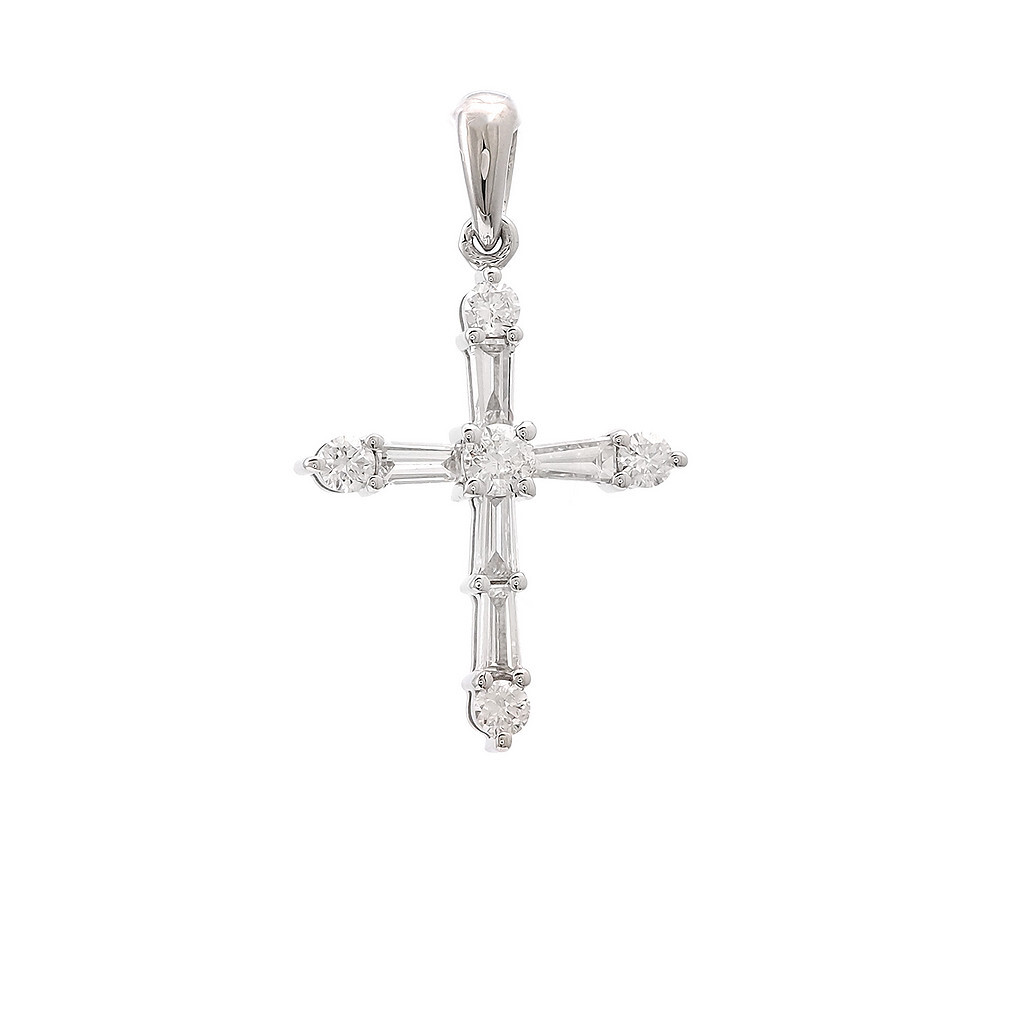 14 KARAT WHITE GOLD DIAMOND CROSS PENDANT. This cross contains round and baguette diamonds. These diamonds have a total carat weight of 0.35 carats.