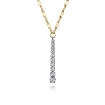 14 Karat White and Yellow Gold Diamond Vertical Bar Link Necklace. This stunning piece features a captivating vertical bar set with diamonds. The two-tone design, adds a modern twist to classic luxury. The necklace's paperclip chain and brilliant pendant create a striking visual contrast, ensuring you stand out with understated glamour. These diamonds have a total carat weight of 0.50 carats.