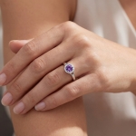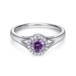 Add a touch of color and sparkle with this 14 karat white gold amethyst and diamond halo ring. Featuring a 0.38 carat round amethyst surrounded by 0.06 carats of diamonds, this elegant design brings timeless beauty to both everyday wear and special occasions.